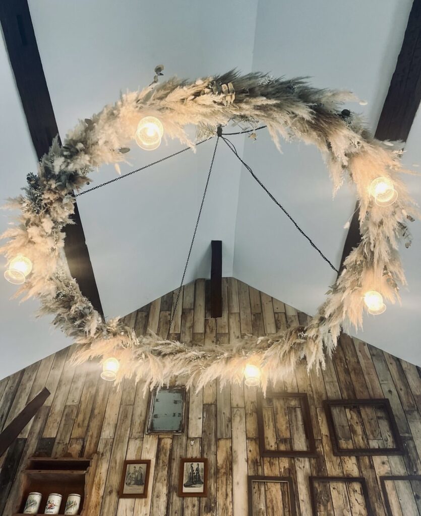 Mesurant plus de 2m de diamètre, ce luminaire fleuri a entièrement été pensé et réalisé par nos équipes. De la conception à la production, chaque étape a été minutieusement orchestrée pour offrir une pièce d’exception, alliant esthétique et savoir-faire artisanal, et apportant une touche végétale unique à l’espace.