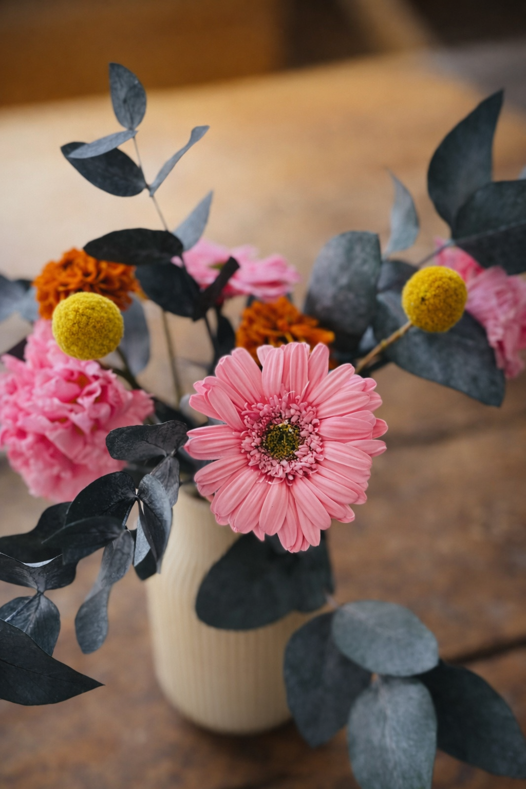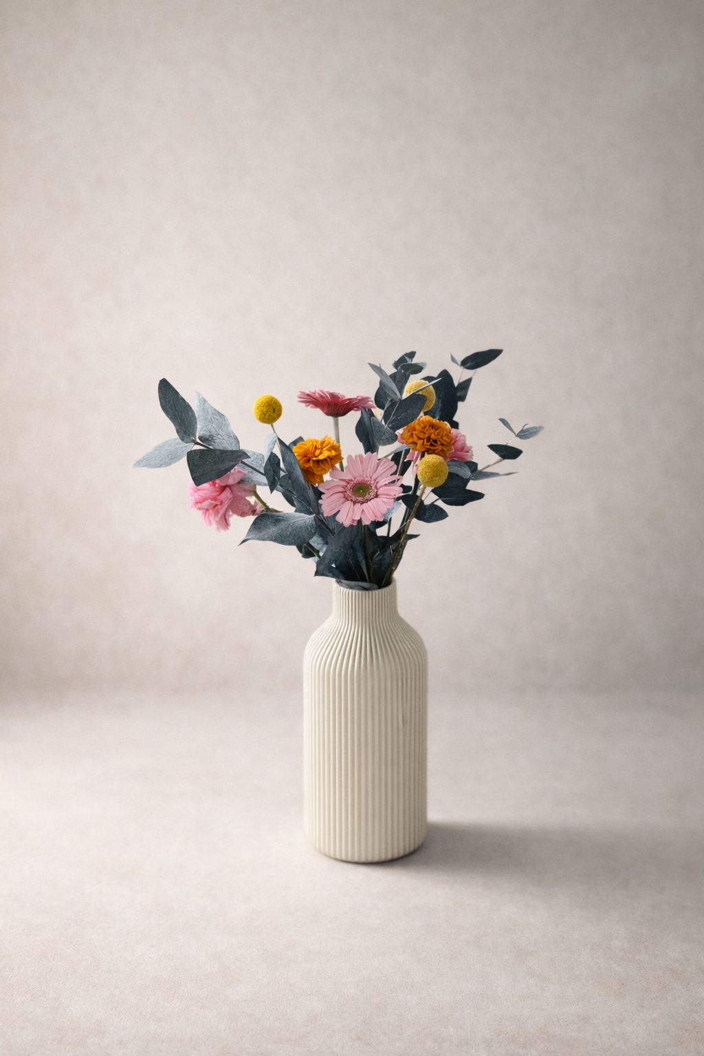 Ce bouquet est réalisé à partir de fleurs et feuillages stabilisés, traités selon un savoir-faire artisanal exigeant. Chaque assemblage est fait à la main dans notre atelier, nécessitant du temps, de la précision et une attention particulière pour garantir un rendu durable et esthétique.
