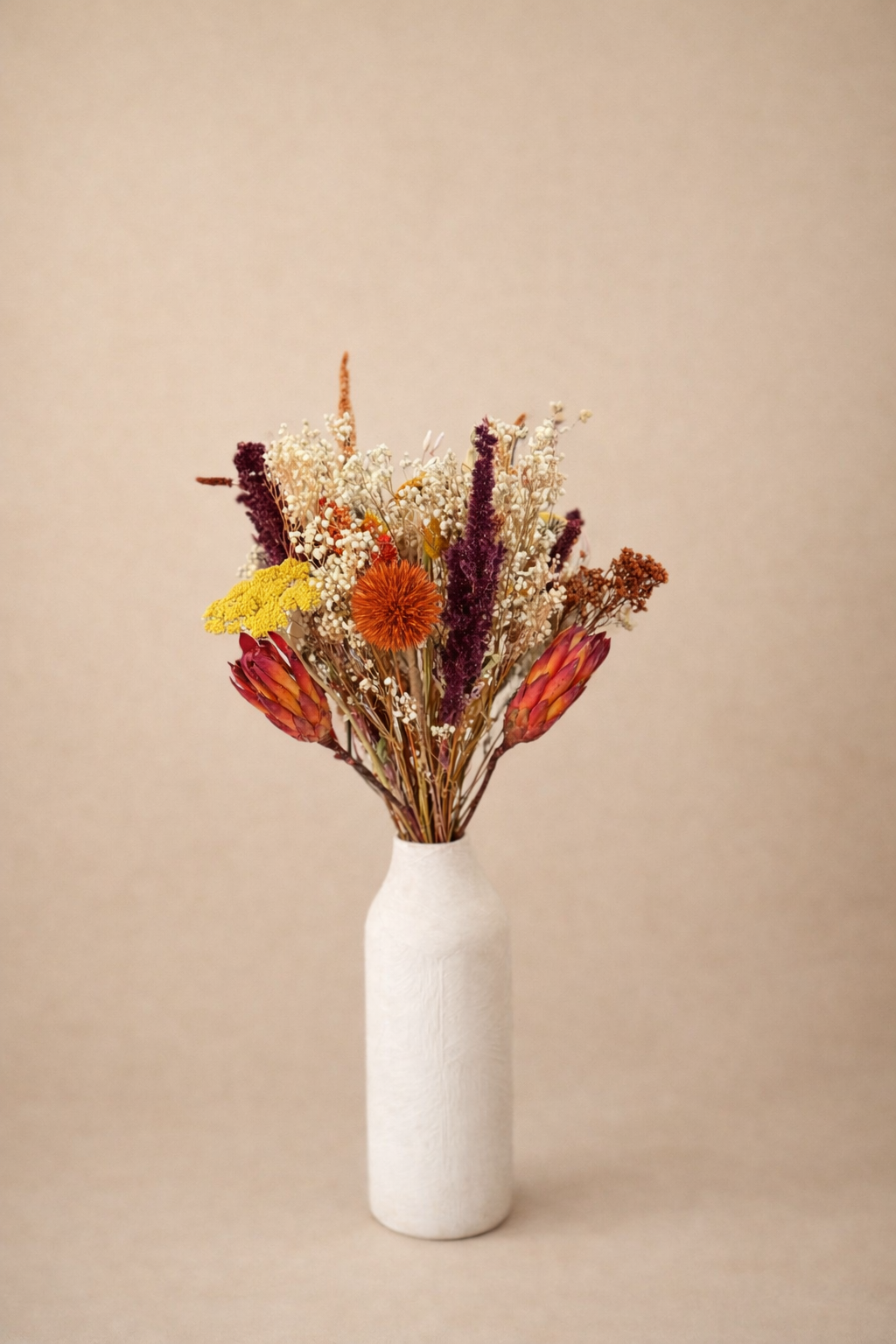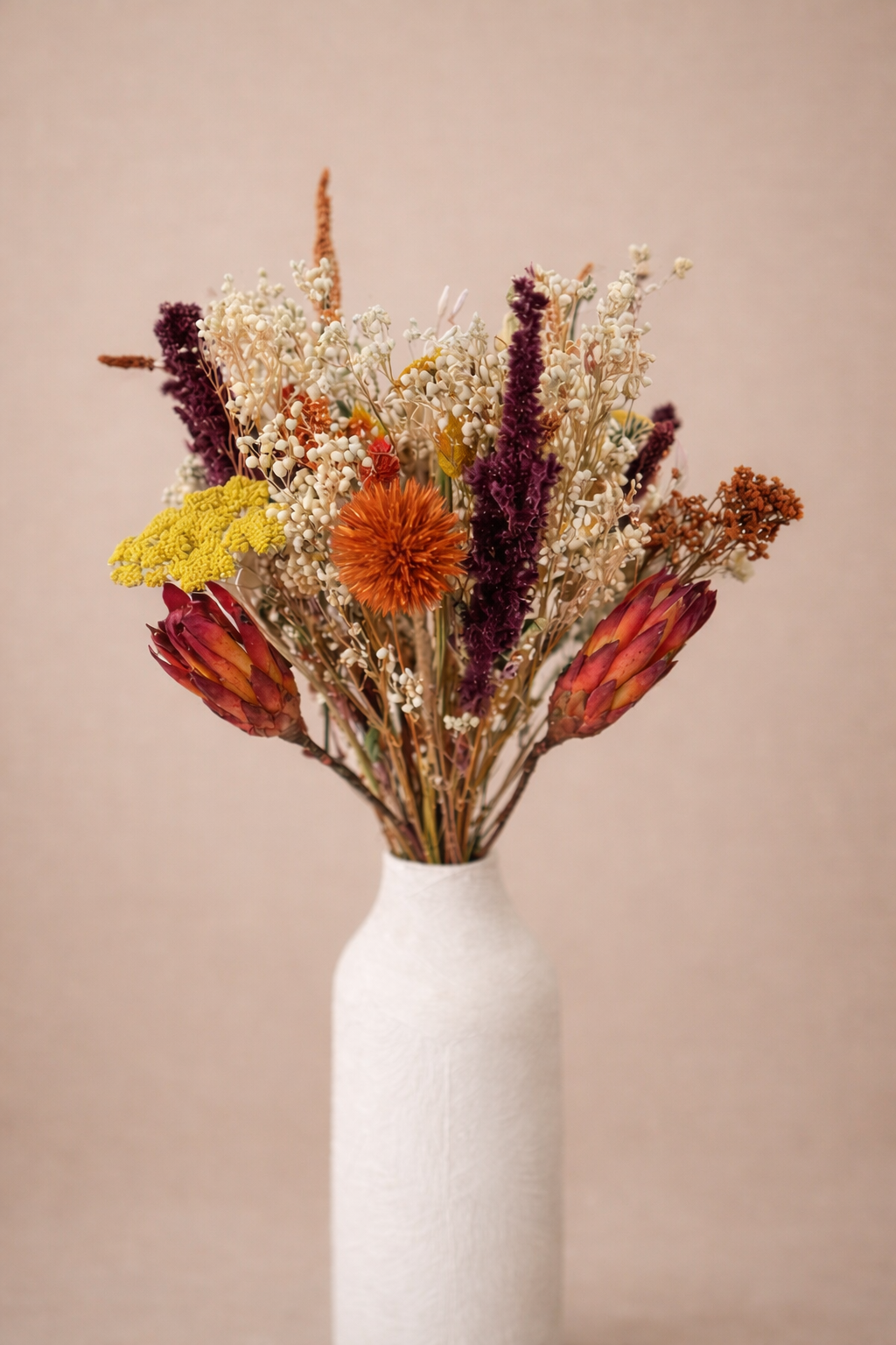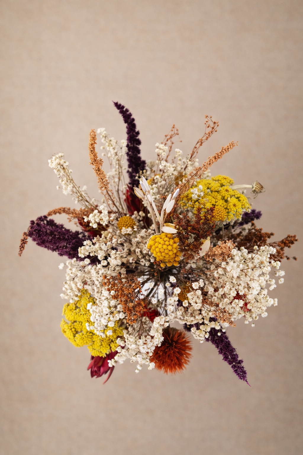 Avoine, achillées, statice, phalaris, lavande, eucalyptus, immortelles (la sélection peut varier en fonction des saisons, tout en respectant l’esprit du bouquet).